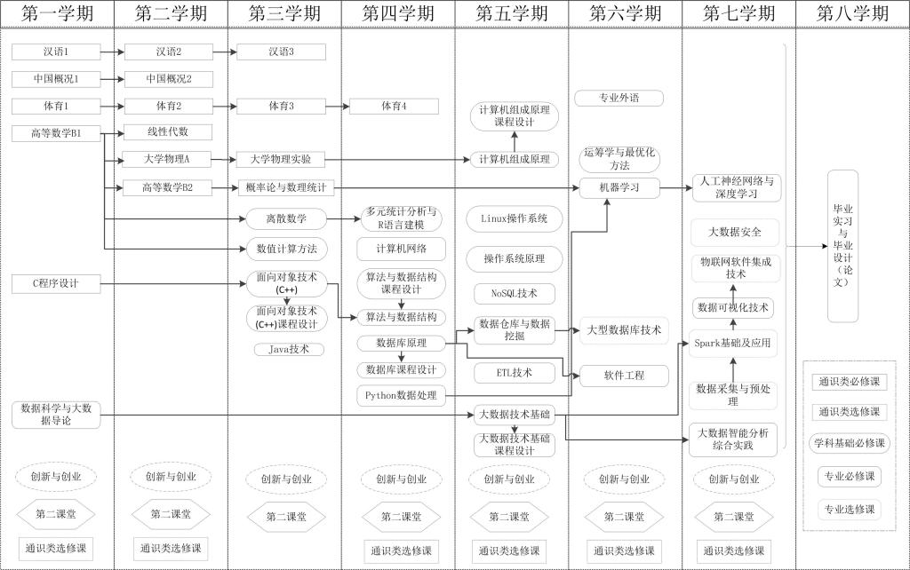 离散数学,数值计算方法,多元统计分析与R语言建模,运筹学与最优化方法,Python数据处理,Java技术,C程序设计,算法与数据结构(双语),数据库原理,软件工程,计算机网络(双语),计算机组成原理,操作系统原理,数据科学与大数据导论,算法设计与分析, ETL技术,数据仓库与数据挖掘,大数据技术基础,人工神经网络与深度学习,机器学习,数据可视化技术,NoSQL数据库技术。