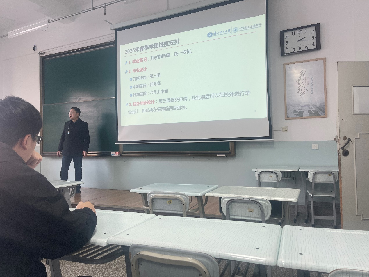 本次动员大会由计算机系主任徐志刚教授主持。活动伊始,徐老师向两个专业的员工详细介绍了2025届毕业设计的基本情况,包括毕业设计的具体流程、时间节点、成绩构成及相关要求。然后,徐老师带领同学们一起学习了《教育部关于印发〈本科毕业论文(设计)抽检办法(试行)〉的通知》、《jinnian金年会本科毕业设计(论文)抽检实施办法》、《jinnian金年会教务处关于做好本科毕业设计(论文)查重检测工作的通知》等相关文件,并对文件中关于毕业设计质量的相关规定进行了详细解读。他强调指出,毕业设计的质量直接关系到学位授予资格,员工们必须严格遵守学术规范,认真对待毕业设计相关工作,确保毕业设计的原创性和设计质量。最后,徐老师针对毕业设计工作给同学们提出了几点希望和建议。他强调,毕业设计不仅是对员工四年所学知识的一次全面检验,也是同学们踏入职场前的最重要的一个实践环节。他希望各位同学高度重视,积极投入,在毕业设计进行过程中与指导老师和周围同学加强沟通交流,按时完成各项任务,确保毕业设计工作圆满完成。
