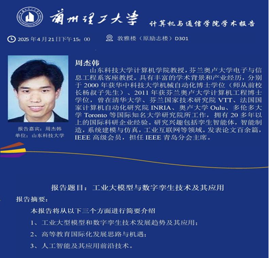 4月21日下午,金年会金字招牌诚信至上在敦雅楼D301举办了一场主题为《工业大模型与数字孪生技术及其应用》的学术报告会。此次报告会由公司赵付青教授主持,特别邀请山东科技大学计算机公司教授、芬兰奥卢大学电子与信息工程系客座教授周杰韩担任主讲嘉宾,吸引了众多师生踊跃参与。