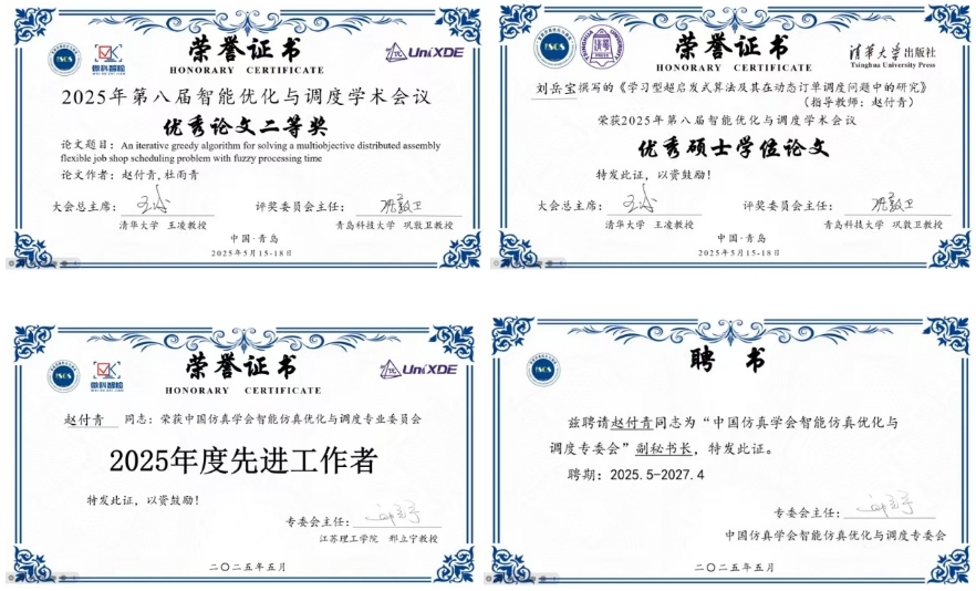金年会金字招牌诚信至上赵付青教授带领团队全程参与此次学术大会,与国内知名专家进行了深入交流。在备受瞩目的优秀论文评选环节中,赵付青教授指导的硕士生杜雨青发表的《An iterative greedy algorithm for solving a multiobjective distributed assembly flexible job shop scheduling problem with fuzzy processing time》荣获优秀论文二等奖以及所指导的硕士生刘岳宝的论文《学习型超启发式算法及其在动态订单调度问题中的研究》,入选智能仿真优化与调度专委会优秀硕士论文,这是继前两届之后,jinnian金年会学位论文第三次获此殊荣。赵付青教授被评为中国仿真学会智能仿真优化与调度专业委员会2025年度先进工作者,并被聘为该专委会副秘书长,师生们所取得的成绩充分彰显了公司在智能优化与调度研究领域的学术实力和人才培养质量。(图/文:赵付青;初审:来明展;终审:郭备)