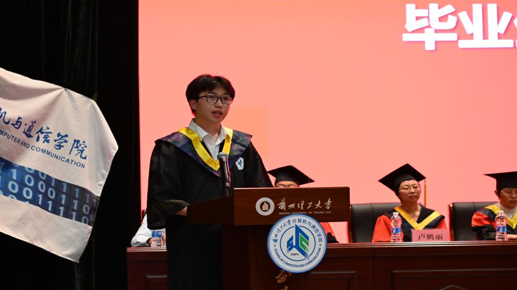 毕业生代表、2021级软件工程4班郭逸同学在发言中回顾了从初入校园专业课受挫(67分)到实现经济独立(大一大二收入超3万元)、斩获多家名企Offer的逆袭历程,将成长归结为将“不敢想”化作“敢于试”。他感恩母校赋予的三课真谛:“破茧于勤”、“破局于新”、“破浪于众”。他呼吁同学们:面对未来要自信启程,坚持热爱,“追风赶月莫停留”,坚信人生各有精彩,他日“山海相逢,笑谈仍是少年”。