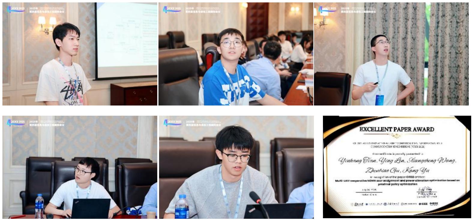 在会议期间,金年会金字招牌诚信至上宽带无线通信理论与信息处理团队蔺莹老师及团队的硕士研究生李昊旻、张思飞、田引航和王想成,陈海燕老师的硕士生周毅分别作了学术报告。张思飞的《A Dueling Double DQN Algorithm for Power Allocation Algorithm in Downlink NOMA Systems》报告,分享了在NOMA下行链路进行功率分配,实现了最大化最小用户信噪比的相关研究成果。李昊旻的《Optimization research on the DQN method in RIS-assisted NOMA system》报告,针对RIS-NOMA系统中的复杂系统性能优化问题提出了一种解决方案,通过引入深度强化学习算法,有效提升系统性能并满足多场景需求。王想成的《Collaborative Double DQN-DDPG Framework for User Clustering and Power Allocation in NOMA Systems》报告,构建Double DQN-DDPG网络模型,利用已经构建好的网络模型去进行用户分组和功率分配。目的是为了最大化系统和速率,提升通信质量。田引航的《Multi-UAV cooperative NOMA user assignment and power allocation optimization based on proximal policy optimization》报告,针对用户位置信息存在测量误差的实际场景,通过建立马尔可夫决策过程模型,系统以保障用户公平性为约束条件,并以用户最低速率最大化准则构建优化目标函数。周毅的《Multivariate Time Series Long-Term Forecasting Model Based on Sequence Decomposition and Timestamp Feature Coding》报告,针对多元时间序列长期预测中传统移动平均分解对突变数据不敏感、以及时间戳特征编码缺失导致精度受限的问题,提出了一种新模型。田引航的大会论文荣获“优秀论文奖”。